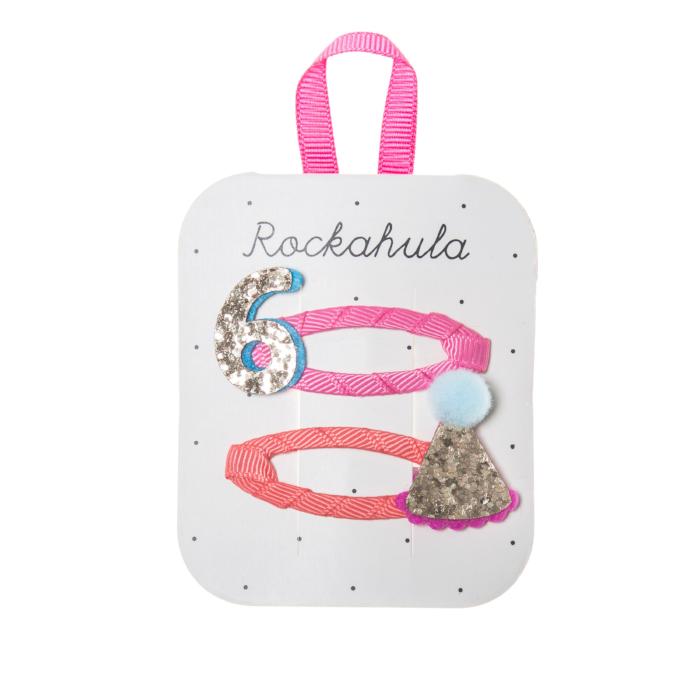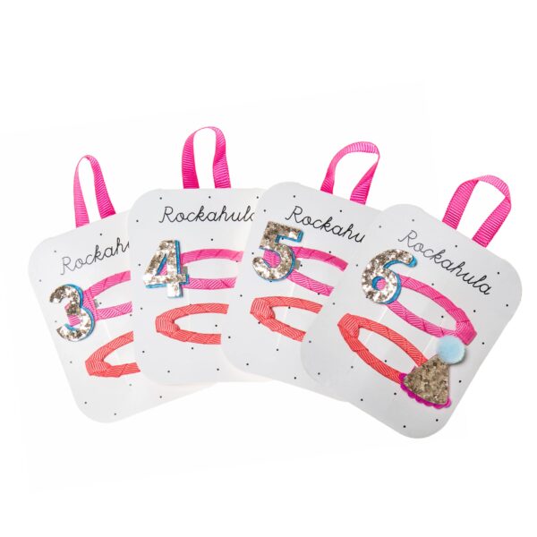 Er is er een jarig, hoera hoera! Is jouw kindje jarig? Dan mogen de verjaardagspeldjes van Rockahula niet ontbreken. De haarclips zijn versierd met roze en koraal lint en glitter cijfers en een glitter feesthoedje! Draag deze speldjes tijdens jouw feestje en iedereen zal direct zien dat je jarig bent! Deze kinderhaarspeldjes zijn niet alleen mooi en feestelijk, ze zijn ook heel handig om de haren uit het gezicht van je kindje te houden tijdens het spelen, het eten van taart of tijdens het uitpakken van cadeautjes. De haarspeldjes zijn beschikbaar in de cijfers 3-6 jaar.
